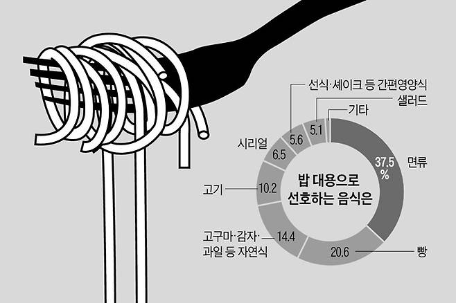 경기도 일산에서 아이 둘을 키우는 워킹맘 김지영(36)씨도 “시간 여유가 있는 평일 저녁이나 주말을 제외하고 빵과 면으로 식사를 대신하는 날이 많다”며 “바쁜 아침 시간에 시간을 절약하고 몇 분이라도 잠을 자기 위한 나름의 생존 방법”이라고 했다. 바쁜 일상을 사는 현대인들에게 밥심 대신 면심이나 빵심이 중요해지는 이유다.
