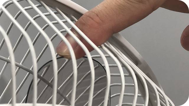 C는 중국 브랜드 선풍기다. 3개 제품 중 날개와 망 사이 거리가 가장 좁았다. 먼저 오른쪽 측면에 손가락을 넣었다. 당황스러울 정도로 바로 날개에 닿는다.