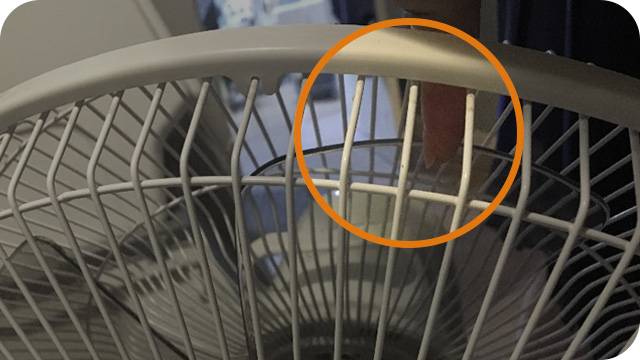 C선풍기를 다시 살펴봤다. 일단 망과 망 사이의 간격은 최소 0.8~1.0cm로 큰 문제는 없어 보인다. 테스트핑거의 굵기는 1.2cm니 말이다. 하지만 날개와 망 사이 간격을 확인해보면 이야기가 달라진다.