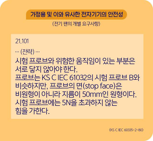 '가정용 및 이와 유사한 전자기기의 안전성(전기 팬의 개별 요구사항)'을 보면 아래 내용이 있다.