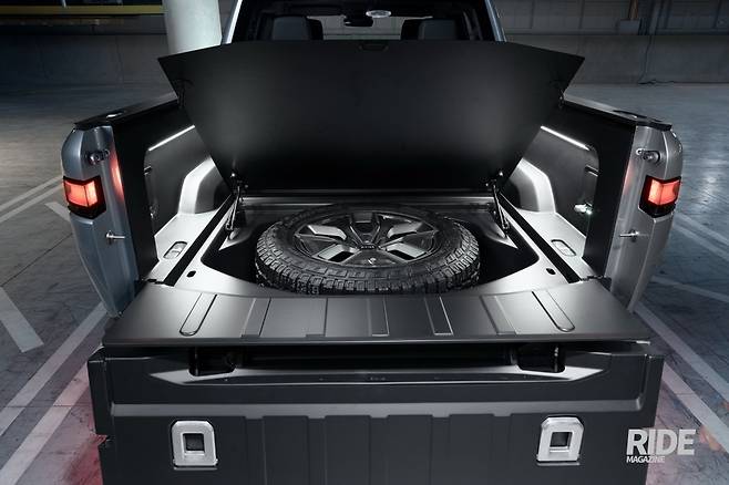 온/오프로드를 넘나드는 픽업트럭 본연의 임무를 위해 서스펜션은 에어스프링과 어댑티드 댐퍼를 사용하며 프론트에 더블위시본, 리어에 멀티링크 방식을 적용한다. 모터는 네 바퀴에 각각 탑재되어 AWD를 구현했다. 마치 전자제품처럼 ‘설정 변경’을 통해 다양한 노면에 최적화된 주행성능을 이끌어낼 수 있다.