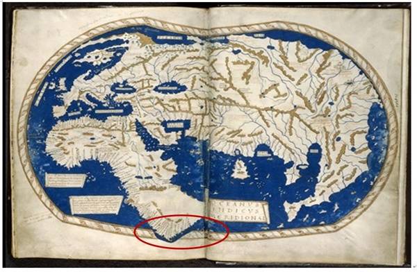 이처럼 15세기 말에 이르러 비로소 서양인들에게 아프리카 남쪽이 바다로 둘러싸여 있다는 사실이 알려지고 인도양이 열렸습니다. 하지만 여전히 남아프리카의 형상은 왜곡이 심합니다. 이 지도와 우리의 강리도(1402)이미지와 비교해 보시기 바랍니다.