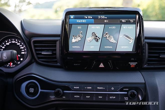리드미컬한 배기음 연출의 가장 큰 공은 레브매칭 기능에 있다. 다운시프팅 상황에서 기어를 밀어넣는 순간 엔진회전수를 바퀴회전수에 맞춰 클러치 미트에 따른 울컥임이 전혀 없다. 해당 기능 버튼은 따로 마련돼 일상주행에서도 꽤나 유용하게 사용할 수 있다.
