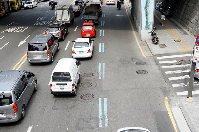 차선을 형태로 나누면 점선과 실선, 그리고 두 개의 선으로 되어 있는 복선으로 구분된다.