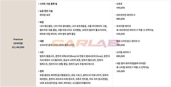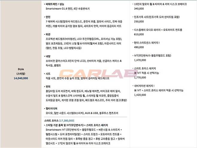 ▲스마트스트림 가솔린 1.6이 스타일 1,551만 원(IVT 적용 기준, MT 기준 1,404만 원), 스마트 1,796만 원, 프리미엄 2,214만 원 ▲디젤 1.6이 스타일 1,796만 원, 스마트 2,037만 원, 프리미엄 2,454만 원 ▲LPi 1.6이 스타일 1,617만 원, 스마트 1,861만 원, 모던 2,010만 원이다. (※ 개소세 3.5% 기준, LPi 모델은 렌터카 및 장애인용만 운영)