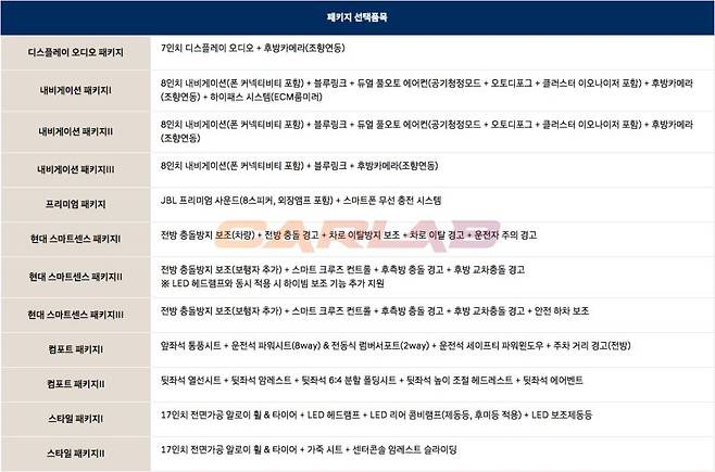 먼저 ‘컴포트 패키지 1’에는 앞 좌석 통풍시트, 운전석 파워시트 & 전동식 럼버 서포트, 운전석 세이프티 파워윈도우, 전방 주차 거리 경고 등 운전의 편의성을 향상시켜주는 사양을 구성했다.