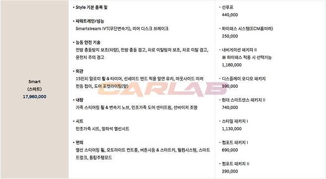‘스마트 초이스’는 스마트스트림 가솔린 1.6 모델에 버튼 시동 & 스마트키, 후측방 충돌 경고, 앞 좌석 열선시트 등 고객 선호 사양들을 합리적인 가격으로 모아 놓은 패키지다.