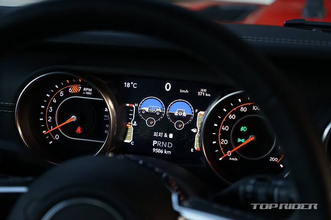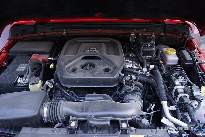 신형 랭글러의 파워트레인은 대부분의 주행을 2000rpm 아래에서 소화한다. 다단화 변속기와 함께 저회전 토크가 강조된 터보엔진은 특히 발진가속과 중저속에서 경쾌한 가속감을 전한다. 2톤을 넘어서는 무게가 의식되지 않는 가볍고 빠른 가속력이다.