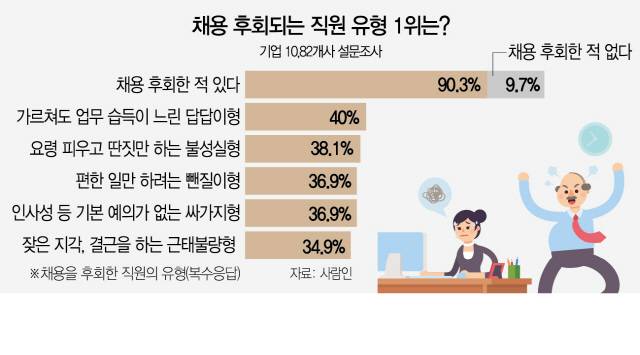 16일 취업포털 사람인에 따르면 기업 인사담당자 1,082명을 대상으로 채용을 후회한 직원이 있는지 여부를 조사한 결과 90.3%가 '있다'고 답했다.