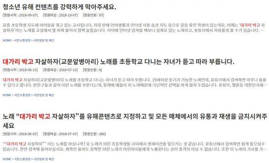 지난해 6월 27일 음원사이트를 통해 공개된 3인조 혼성그룹 교문 앞 병아리의 '대가리 박고 자살하자(대.박.자)'는 곡은 유튜브에서만 조회수 146만회를 기록하며 특히 초등학생들 사이에서 선풍적인 인기를 끌고 있다.