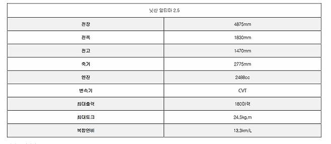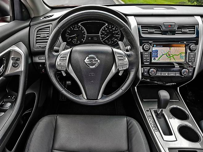 시동을 걸고 시승에 나섰다. 주행성능은 역시나 발군이다. 전륜구동임에도 '다이내믹 세단'이라는 슬로건이 붙는다. 알티마의 주력 엔진은 2.5리터 4기통 자연흡기 가솔린 엔진이다. 최고출력 180마력, 최대토크 24.5kg.m를 발휘, CVT와 매칭된다. 정지상태에서 100km/h 도달 시간도 8초대로 특별하진 않다. 하지만 시동을 켜고 고속도로나 구불구불한 산길에 들어서면 의아할 정도로 고속 주행 안정성이 매우 뛰어나다. 코너링도 상당한 수준이다.