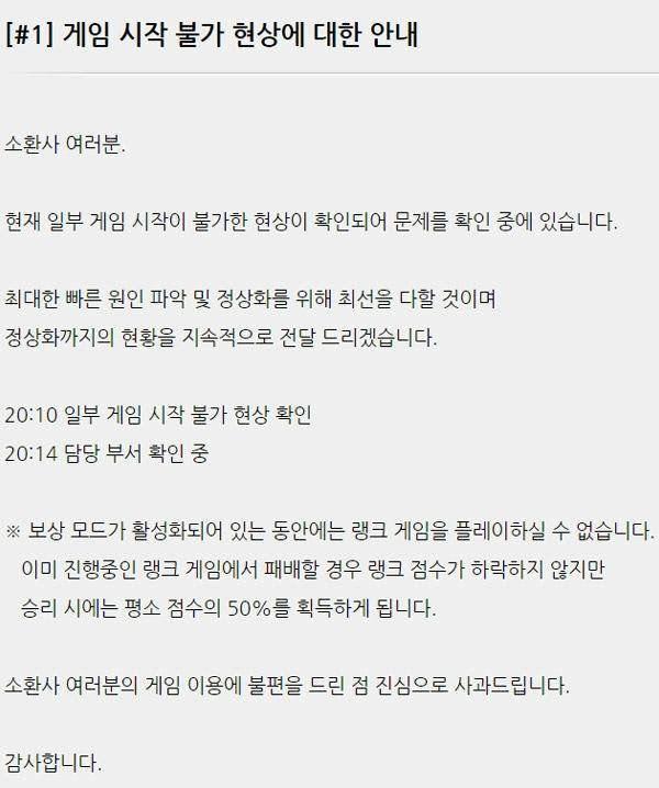 제작사 측은 “현재 일부 게임 시작이 불가한 현상이 확인되어 문제를 확인 중에 있습니다. 최대한 빠른 원인 파악 및 정상화를 위해 최선을 다할 것이며 정상화까지의 현황을 지속적으로 전달 드리겠습니다”라며 “소환사 여러분의 게임 이용에 불편을 드린 점 진심으로 사과드립니다”라고 안내했다.