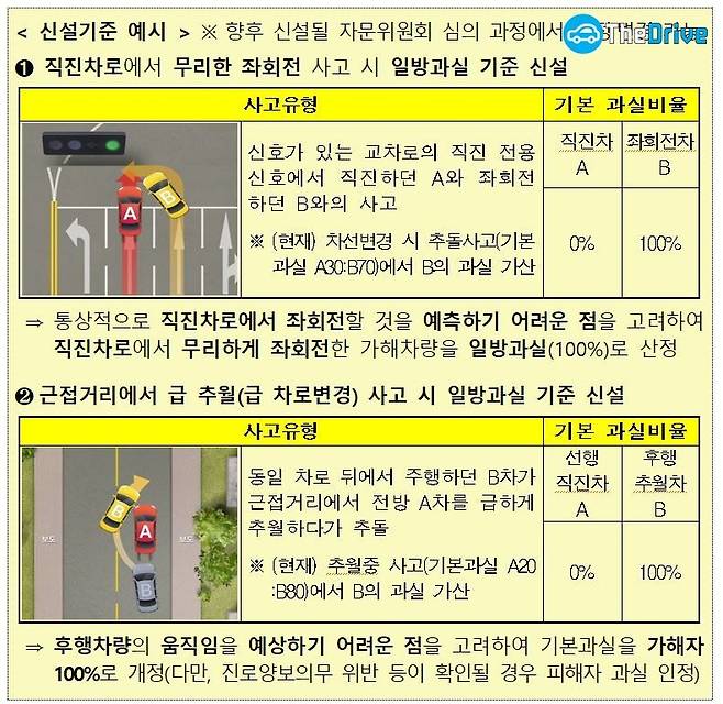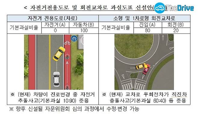현재는 자동차가 진로 변경 중 자전거 전용도로 위에서 자전거와 추돌사고를 낼 경우 자전거에도 10%의 과실비율을 부여했으나, 앞으로는 자동차 일방과실로 처리된다. 회전교차로 진입 과정에서의 사고 시 과실비율도 ‘진입 차량 60%, 회전 차량 40%’에서 ‘진입 차량 80%, 회전 차량 20%’로 바뀐다.