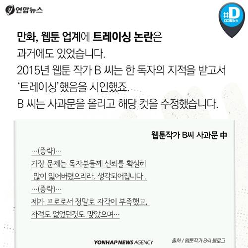 만화, 웹툰 업계에 트레이싱 논란은 과거에도 있었습니다. 2015년 웹툰 작가 B 씨는 한 독자의 지적을 받고서 '트레이싱'했음을 시인했죠. B 씨는 사과문을 올리고 해당 컷을 수정했습니다.