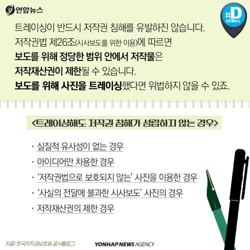 트레이싱이 반드시 저작권 침해를 유발하진 않습니다. 저작권법 제26조(시사보도를 위한 이용)에 따르면 보도를 위해 정당한 범위 안에서 저작물은 저작재산권이 제한될 수 있습니다. 보도를 위해 사진을 트레이싱했다면 위법하지 않을 수 있죠.