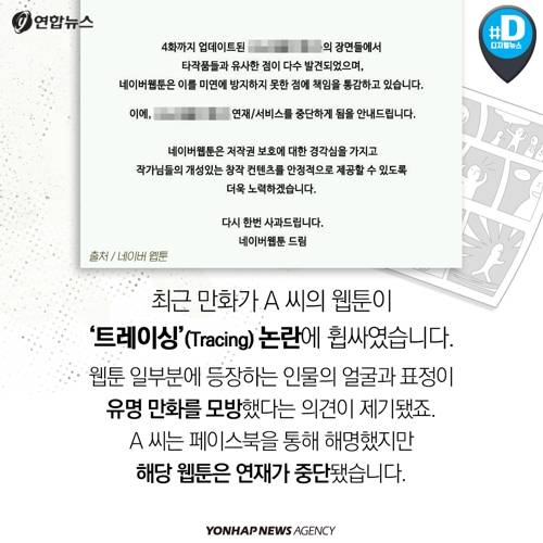 최근 만화가 A 씨의 웹툰이 '트레이싱'(Tracing) 논란에 휩싸였습니다. 웹툰 일부분에 등장하는 인물의 얼굴과 표정이 유명 만화를 모방했다는 의견이 제기됐죠. A 씨는 페이스북을 통해 해명했지만 해당 웹툰은 연재가 중단됐습니다.