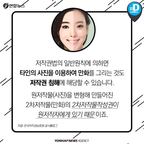 저작권법의 일반원칙에 의하면 타인의 사진을 이용하여 만화를 그리는 것도 저작권 침해에 해당할 수 있습니다. 원저작물(사진)을 변형해 만들어진 2차저작물(만화)의 2차저작물작성권이 원저작자에게 있기 때문이죠.
