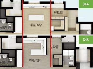 처음에는 두 평면이 비슷해보였지만 하나씩 뜯어서 살펴보니 장단점이 각기 다르다는 것을 알 수 있다. 건설사도 타입을 다양화 하면서도 형평성을 맞춰 설계하기 때문에 꼼꼼히 살펴보는 것이 좋다. 하나가 좋으면 하나가 아쉬울 수 있어서다. ‘다산 신안인스빌 퍼스트포레’의 경우, 주방이 넓고 수납 공간이 많은 구조를 원하는 수요자라면 A타입을, 침실과 자녀방 외에 또다른 알파 공간이 필요한 수요자라면 B타입을 선택하는 것이 좋다. 공간 별 면적 차이를 알고 싶다면 두 평면도를 나란히 놓고 비교하는 것을 추천한다.