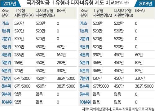 예컨대 과거Ⅰ유형 장학금을 지원받았던 셋째 대학생이 신설된 다자녀 유형으로 갈아탈 경우 지난해 기준으로 연간 학비 절감 효과가 기초∼2분위와 3분위는 각각 아예 없거나 60만원에 그친 반면 상대적으로 고소득층인 7~8분위는 382만5000원을 절감하게 된다.