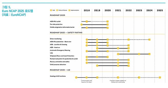 AEB 시스템의 사고 방지/예방 효과로 인하여 신차평가 시 가점을 부여하거나 의무 장착을 추진하고 있다. EuroNCAP은 2014년 50km/h 이하의 저속 충돌상황에서의 자동제동시스템인 AEB-city, 20km/h에서 80km/h까지의 AEB-interurban을 평가 항목에 추가하였고 2016년부터는 보행자 보호를 위한 AEB pedestrian도 추가하였다. 또한 이륜차 등 교통 약자에 대한 AEB 시스템 적용 일정이 공개되었다.