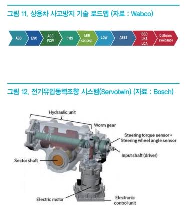 <그림 11>은 독일 Wabco에서 제시하고 있는 상용차 사고방지 기술 로드맵으로 국내에서는 ABS, ESC 등 가장 기본적인 제동제어 기술 확보가 되어 있지 않기 때문에 그 이후 단계의 첨단 기술 개발도 해외에 의존해야 하는 실정이다. 또한 전기유압동력조향(Electro Hydraulic Power Steering) 시스템은 상용차 전동식 조향시스템<그림 12>으로 상용차의 LKAS, 군집 주행, 자율주행 등을 위한 조향 제어를 위해 독자 개발이 필수적인 기술이라고 할 수 있으며 산학연관 협력을 통한 기술 개발이 시급하다.