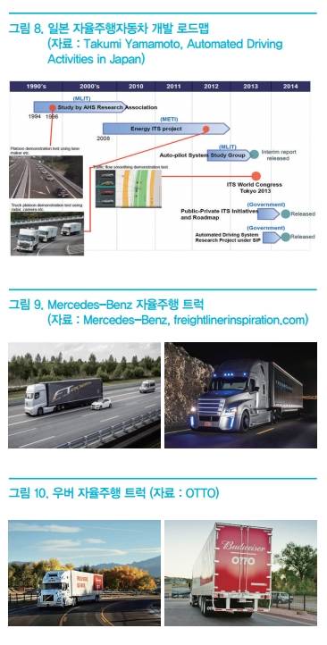 자율주행상용차 분야에서는 독일의 Mercedes-Benz가 가장 앞서고 있다. 2014년 7월 세계에서 처음으로 자율주행 트럭 ‘메르세데스 벤츠 퓨처 트럭 2025’(Mercedes-Benz Future Truck 2025)를 발표하였으며 독일 마그데부르크 인근 아우토반에서 40여 분간의 시험주행을 실시하였다<그림 9>. 이후 독일에서 1만 마일(16,000km)의 주행 테스트를 실시하였으며 2015년 5월 미국 네바다주 정부는 이 트럭 2대에 정식 도로를 운행할 수 있는 허가증을 발급하였다. 이 트럭에는 Benz가 개발한 ‘하이웨이 파일럿’ 시스템을 장착하였으며 스테레오 카메라와 레이더를 통해 들어오는 정보를 이용하여 차선 유지, 충돌 회피, 속도 조절, 제동, 핸들링 등의 기능을 작동시켜 자동주행을 구현하였다. 이 트럭은 고속도로에 진입한 뒤 ‘하이웨이 파일럿’ 버튼을 누르면 자율주행시스템이 작동하며 외부에서 차량 조명 색의 변화를 통하여 자율 주행 여부를 확인할 수 있도록 하였다.