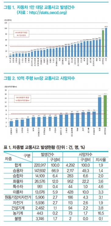 국내 자동차 사고율은 OECD(경제협력개발기구, Organization for Economic Cooperation and Development) 회원국 중 최하위를 기록하고 있다(도로교통공단, OECD 회원국 교통사고 비교, 2017-0216-043). <그림 1>에서 보는 바와 같이 2015년도 자동차 1만 대당 교통사고 발생건수에서 우리나라는 93.7건으로 32개국 중 터키(102건) 다음으로 많이 발생한 것으로 나타났는데 OECD 회원국 평균인 36.7건에 비해서도 약 2.6배 가량 많이 발생했다. 특히 <그림 2>에서 보는 바와 같이 10억 주행 km당 교통사고 사망자수에서 우리나라는 15.5명으로 자료가 파악된 18개국 중에서 가장 높게 나타났으며 OECD 회원국 평균인 6.3명에 비해 2.4배 많은 것으로 분석되었다.