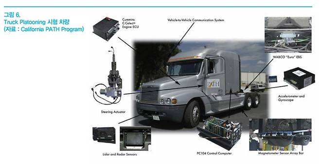 미국 캘리포니아의 PATH 프로그램 중에서 자동운전도로시스템(Automated Highway Systems)은 캘리포니아 주와 카네기멜론 대학에서 시연한 군집주행기술로 차량의 동시 가감속제어를 통해 차량간격을 줄여 군집운행함으로써 연료와 공기저항을 줄이고 도로 혼잡을 줄이는데 기여할 수 있음을 제시하였다. 트럭 군집주행(2010~2011)에서는 밀리미터 레이더, 라이더, 차차간 통신을 이용하여 종방향을 제어하고 횡방향은 자동적으로 제어하지 않았다<그림 6>. 실험조건은 3대의 트럭을 대상으로 3~4m 간격으로 시속 53mph(85㎞/h)로 주행하였으며 연비개선효과는 선두차 4.54%, 중간차 11.91%, 최종후미차 18.4%를 나타내었으며 약 2배의 도로 사용 효율 증대 효과를 나타내었다.