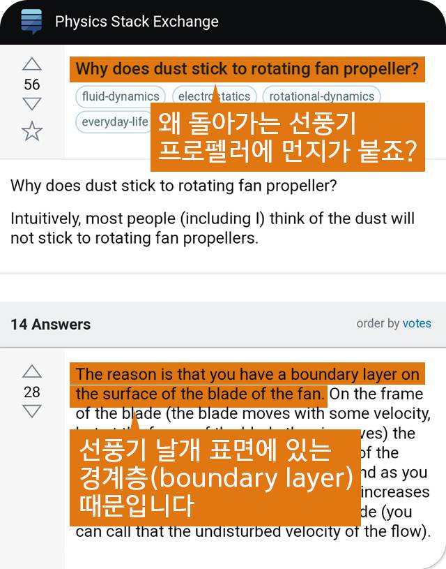 경계층이 뭔지 검색해봤다. 고체의 표면을 지나는 공기가 마찰에 의해 속도가 변하게 되는 층이란다. 무슨 말일까? 이해가 될 듯 말 듯하다. 이게 어떻게 선풍기 먼지를 만들어낸다는 걸까?