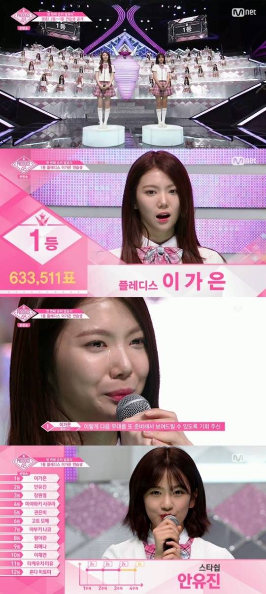 이날 첫 순위 발표식의 1등은 플레디스의 이가은이었다. 이가은은 눈물을 흘리며 "이렇게 다음 무대를 또 준비해서 보여드릴 수 있도록 기회 주신 국민 프로듀서 여러분 정말 감사합니다"라며 "저희 어머니께서 혼자서 저를 엄청 열심히 키워주셨는데 정말 고생 많았고 이제 내가 우리 엄마 안고 갈 테니까 걱정하지 말고 맘 편히 있어요"라고 소감을 밝혔다.