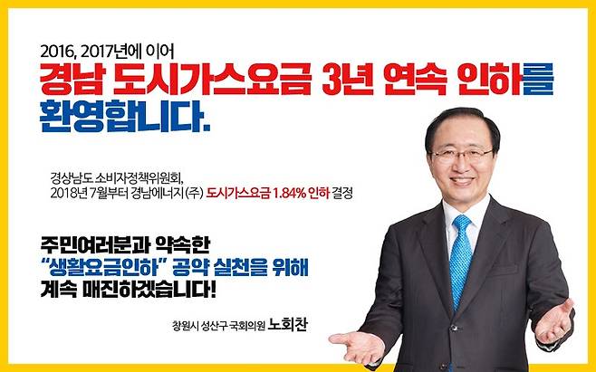 노회찬 의원은 '도시가스 소매요금제도 개선' 등을 위해 활동했고, 창원지역 도시가스 요금을 2016년, 2017년에 이어 2018년에도 인하하는 데 주도적인 역할을 하기도 했다.