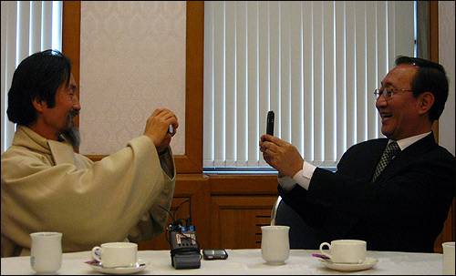 | ▲ 지난 2010년 3월 10일 당시 강기갑 민주노동당 대표와 노회찬 진보신당 대표가 10일 오전 '진보대통합' 회동에서 서로의 모습을 트위터에 올리기 위해 사진 촬영하고 있다. |
