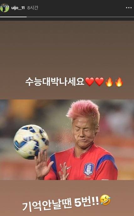 황의조는 14일 저녁 늦게 인스타그램 스토리에 2019 수능을 치르는 수험생을 응원하는 메시지를 띄웠다. “수능 대박 나시라”는 내용과 함께 이승우의 사진 한 장을 첨부했다. 날아오는 공에 반사적으로 눈을 감은 장면이다. 사진에서 이승우는 양손을 모두 펼치고 있다. 황의조는 “기억 안 날 땐 5번”이라고 적었다.
