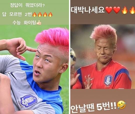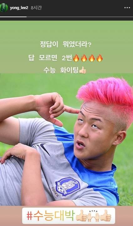 이용도 비슷한 시간 인스타그램 스토리에서 2019 수능 수험생을 응원했다. 이용 역시 이승우 사진을 썼다. 이승우가 그라운드에 누워 손가락을 머리에 대고 골똘히 생각에 잠긴 듯한 모습이 담겼다. 이용은 “정답이 뭐였더라. 답 모르면 2번”이라고 했다. 두 사람 모두 이승우 ‘짤’을 이용했다. 짤은 재밌거나 의미가 깊어 여러 커뮤니티에서 자주 사용되는 사진을 뜻한다.