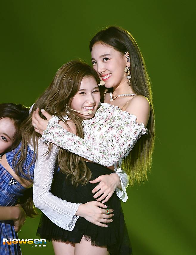 그룹 트와이스(나연, 정연, 모모, 사나, 지효, 미나, 다현, 채영, 쯔위) 사나, 나연이 멋진 무대를 선보이고 있다.