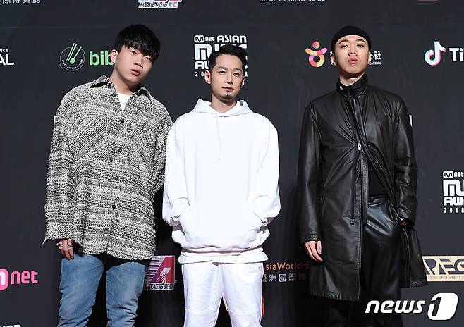 래퍼 더 콰이엇(왼쪽부터), 창모, 비와이가 14일 오후 홍콩 아시아 월드 엑스포 아레나에서 열린 '2018 MAMA PREMIERE in HONG KONG(2018 마마 in 홍콩)' 레드카펫 행사에 참석해 포즈를 취하고 있다. (CJ ENM 제공) 2018.12.14/뉴스1