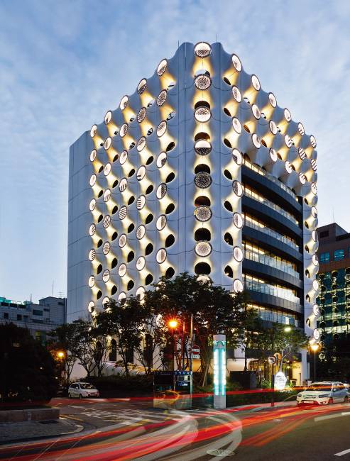하지만 여기엔 또 다른 기술적 문제가 도사리고 있었다. 그런 독특한 외벽을 철근콘크리트 구조로 만들려면 외벽 두께가 18cm, 모듈 하나당 무게가 6.5t이나 돼야 했다. 그만큼 기존 건축물의 실내 공간이 줄어들 수밖에 없었던 것. 그 대안으로 김 대표가 찾아낸 건축자재가 '초고성능콘크리트(UHPC)'다. 일반 콘크리트가 1㎠당 240kg의 하중을 견딘다면 UHPC는 1t 이상 하중을 버틸 수 있어 철근도 따로 필요 없이 외벽 두께를 8cm, 모듈당 무게를 1.5t까지 줄일 수 있었다. 그래서 아예 공장에서 모듈별로 주형을 떠 형태를 만든 뒤 현장에서 조립해 완성한 것이 지금의 독특한 외관을 형성했다.