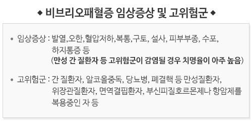 식품의약품안전처는 "환자 대부분이 감염 후 36시간 내 피부에 출혈성 수포가 형성되며, 혈소판 감소와 혈관 내 응고 병증이 발생한다"며 "오염된 해산물을 날로 먹었을 때 잠복기는 3시간∼8일인데, 평균 약 2일"이라고 설명했다.