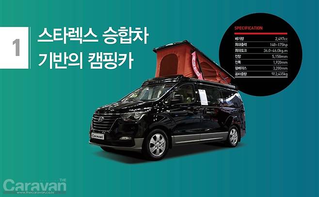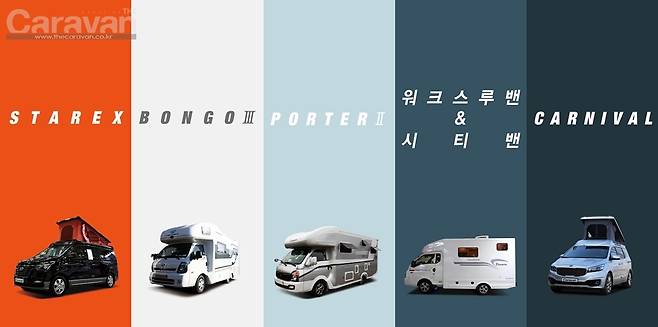 스타렉스 승합차 베이스의 캠핑카는 두 가지 타입으로 양분된다. Class B 타입의 캠핑카와 Class C 타입의 벙커 베드를 갖춘 캠핑카, 좀 더 세부적으로는 3인승과 5인승으로도 구분할 수 있다. 베이스에 따라 2WD, 4WD로도 세분화된다.
