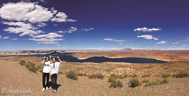 그늘 한 점 없는 모래언덕을 걷는 것에 지칠 무렵 가슴을 뻥 뚫어주는 비현실적인 광경이 내 눈앞에 덩그러니 나타났다. 그저 ‘와..’ 라는 탄성 밖에 나오지 않는 순간이었다.처음엔 홀슈밴드의 말도 안 되는 풍경에 놀라고 두 번째는 발밑에 펼쳐진 낭떠러지의 깊이에 아찔해지는 순간이었다. 캡틴의 설명에 의하면 홀슈밴드의 깊이는 한국의 63빌딩이 들어가고도 남을 정도라고 하니 절벽의 깊이를 실감할 수 있었다. 파란 하늘과 바로 맞닿아 있었던 붉은 홀슈밴드, 그리고 그 홀슈밴드를 굽이치며 흘러가던 콜로라도 강의 푸른 빛깔이 만나서 어디에도 없는 장엄함과 여행자들을 압도하는 반전 매력이 있는 장소였다. 홀슈밴드가 더 감동적인 이유는 ‘어떤 뷰가 나를 반겨줄까’라고 기대하며 모래 언덕을 걸어가는 설레는 시간이 있어서 더 그렇지 않았을까 하는 생각도 들었다.