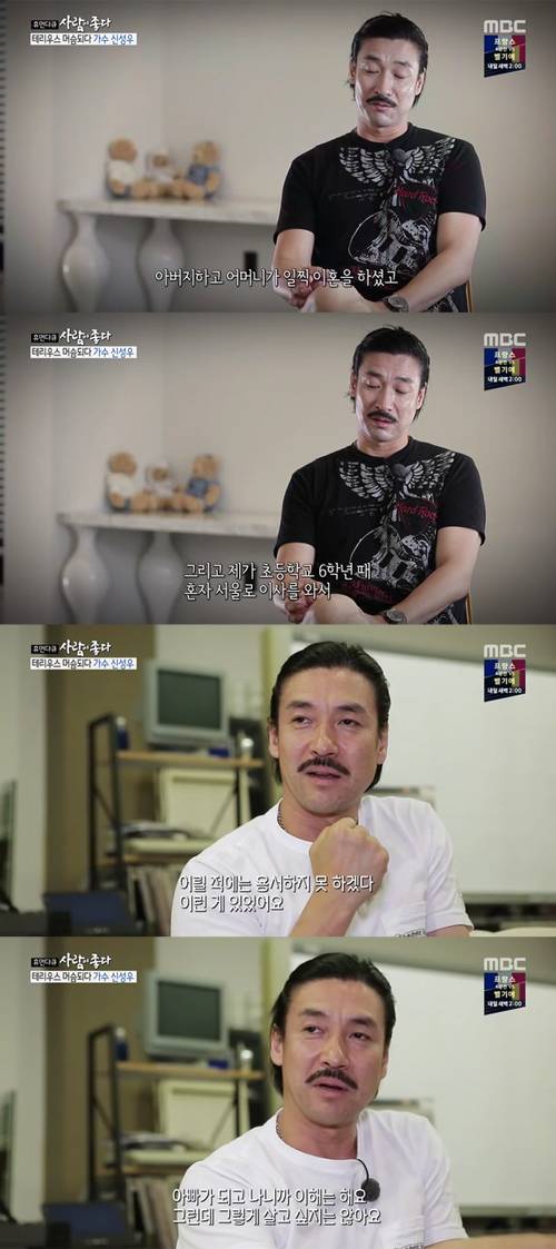 10일 오후 방송된 MBC '휴먼다큐 사람이 좋다'에서 신성우는 "아버지하고 어머니가 일찍 이혼을 하셨다"고 입을 열었다.