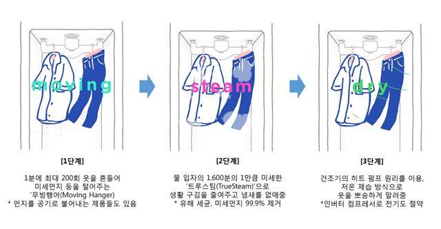 임동휘 LG전자 책임은 “의류관리기에는 세탁기의 스팀 기술, 건조기의 히트 펌프 기술, 냉장고의 온도관리 기술, 에어컨의 기류 제어 기술 등 LG 생활가전의 차별화된 기술이 모두 집약돼 있다”며 “의류관리기를 활용하면 옷에 묻은 미세먼지와 집먼지진드기는 물론 대장균, 황색포도상구균 등 유해 세균도 99.9% 제거된다”고 말했다.