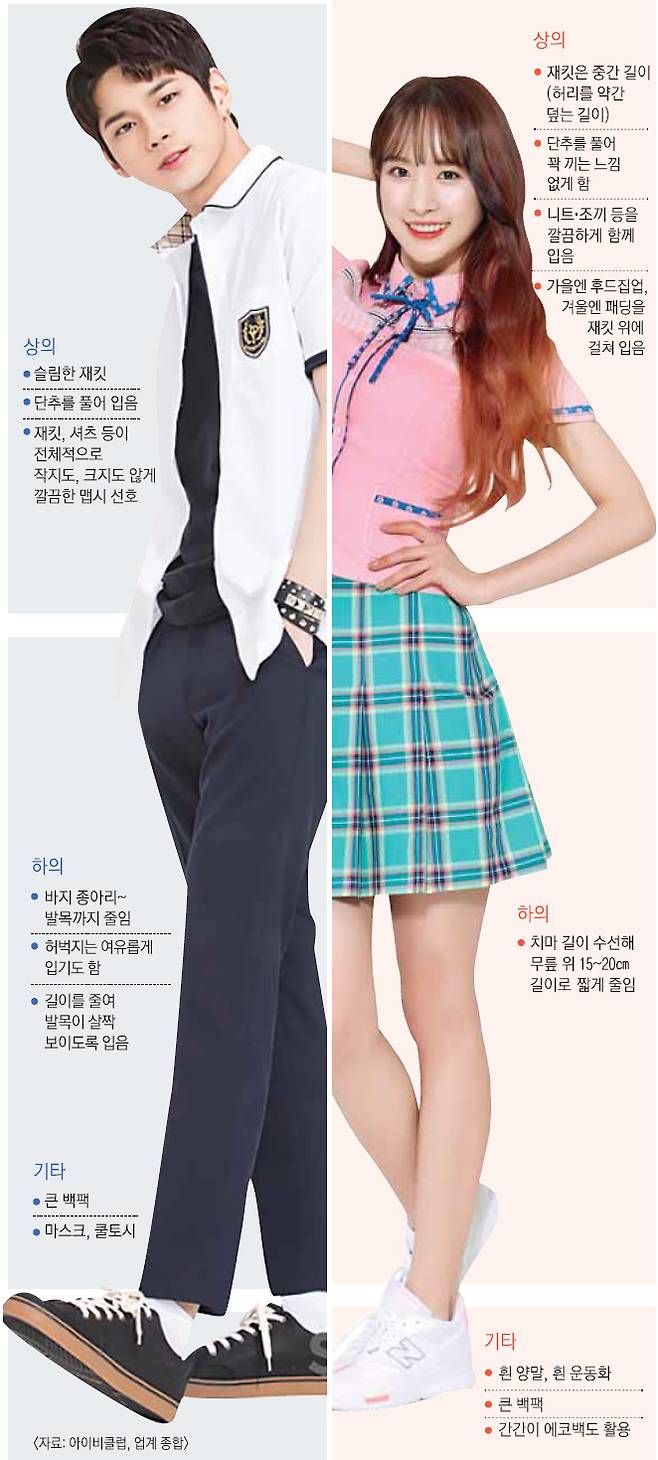 학생들과 업계 의견을 종합해 보면 현재 유행하는 여학생 교복 스타일은 무릎에서 15~20㎝쯤 올라온 짧은 치마에 허리를 약간 덮는 길이의 재킷을 기본으로 한다. 한때 허리가 보이는 짧은 재킷을 많이 입었지만 유행이 지났다. 이 위에 외투를 입는데 가을에는 모자가 달린 후드집업, 겨울에는 패딩을 사실상 교복처럼 입는다. 여기에 흰 양말과 흰색 운동화를 신고, 큰 백팩을 착용하면 ‘교복 룩’이 완성된다. 남학생은 몸에 적당히 맞는 슬림한 재킷을 단추를 푼 채 입으며, 바지 종아리부터 발목까지 다소 타이트한 스키니핏을 선호한다. 마스크나 쿨토시 등을 하는 학생도 있다. 전체적으로 깔끔한 맵시를 선호한다. 유니클로·H&M 등 가격이 싼 패스트패션은 학생들이 애용하는 브랜드다. A 교복업체 디자인팀 관계자는 “교복은 2000년쯤부터 계속 타이트해지기 시작했고 2000년대 후반 긴 치마나 통 큰 바지 등 박시하게 입는 유행이 잠시 있었지만 이후 다시 좁고 짧아졌다”면서 “3~4년 전 정점을 찍은 뒤 최근에는 반바지·반팔 등 편한 디자인으로 넘어가는 추세”라고 말했다.
