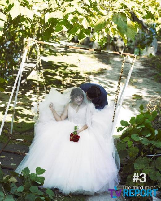 화제가 된 그네 위 웨딩화보 촬영의 정면샷에서도 예비신랑은 이수지를 챙기는 자상한 모습이다.