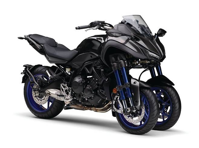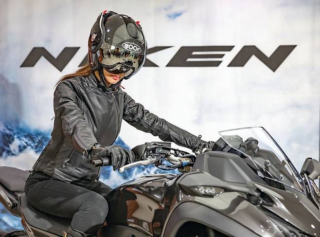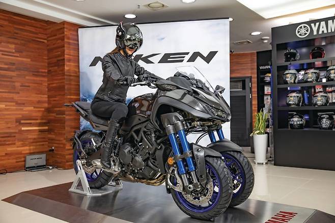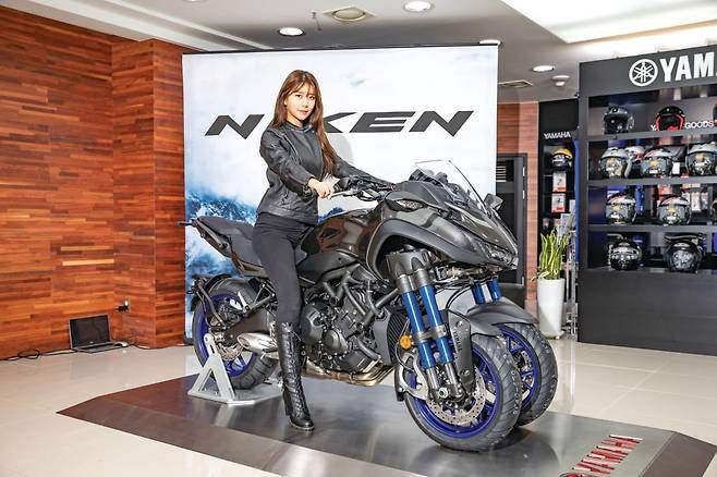야마하의 첫 스포츠 3륜 ‘나이켄’을 한국 야마하의 본사 지점인 한국모터트레이딩 사옥에서 만났다. 뒤쪽은 일반 바이크지만 전면을 바라보는 순간 두 개의 앞바퀴에서 만들어내는 압박감이 상당하다. 마치 미래에서 타임 슬립한 것 같은 디자인이다. 나이켄의 이름은 2개의 검을 의미하는 니켄의 영어식 발음에서 유래한 이름이다.