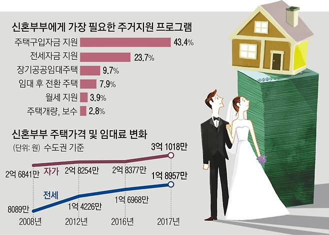 새 보금자리를 마련하려는 신혼부부들의 가장 큰 고민은 역시 집이다. 그동안 모아둔 돈을 모두 합쳐도, 양가 부모가 지원해 주는 돈까지 보태도 웬만한 전셋집은 구하기 어려운 상황이다. 최근 진행된 정부의 신혼부부 패널조사(2016년)에서도 부부자금만으로 주택자금을 마련한다는 가구는 13.1%에 그쳤다.