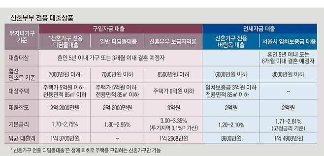 국토부가 지원하는 디딤돌 대출은 신혼부부 합산 연소득이 7000만원 이하여야 가능하다. 주택가격 5억원, 전용면적 85㎡(25평) 이하인 주택에 한해 최대 2억 2000만원까지 대출된다.