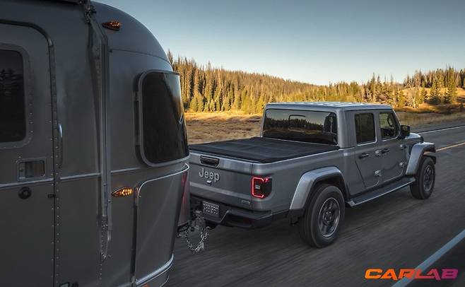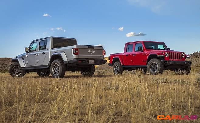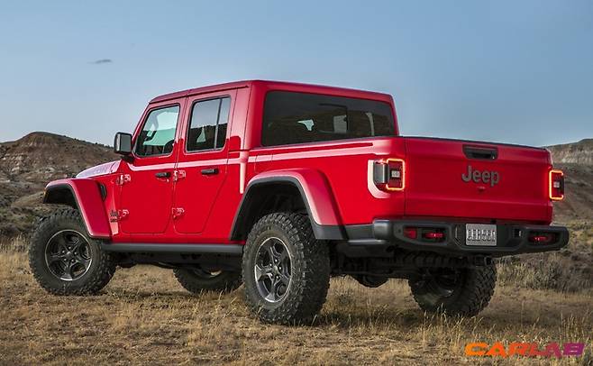 픽업트럭답지 않게 엉덩이가 상당히 매력적이다. 기존에 달려 있던 스페어 타이어가 차체 아래로 내려가면서 지프 로고가 새로 둥지를 틀었다. 짐을 싣고 내릴 때 사용하는 적재함 게이트는 3가지 각도로 고정 가능하다.