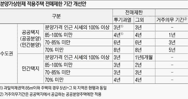 앞으로 수도권 분양가상한제 주택은 그린벨트 해지비율, 면적 등에 관계없이 분양 가격보다 저렴하게 공급되는 공공택지의 공공 및 민간 분양주택에 대해 분양계약 체결 후 3~8년 동안 전매를 할 수 없다. 공공분양주택의 경우는 최대 5년의 거주 의무 기간도 설정된다. 민간택지에 공급되는 분양가상한제 주택은 공공택지 공급주택 전매 제한 기간의 50%만 부과하고, 거주 의무는 없다. 또 공공분양주택을 분양받은 사람이 불가피하게 전매할 경우(예외 인정) 분양받은 주택은 사업시행자에게 되팔아야 한다.