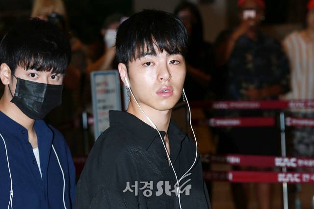 아이콘(iKON) 멤버 정찬우와 송윤형이 일본 도쿄 하네다로 출국하고 있다.